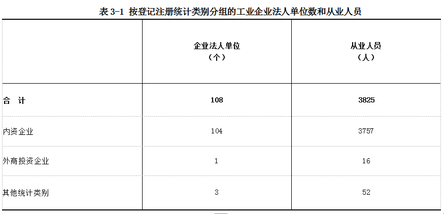 2023年末,全区共有工业企业法人单位[2]108个,比2018年末下降2.7%;从业人员3825人,比2018年末下降28.5%。