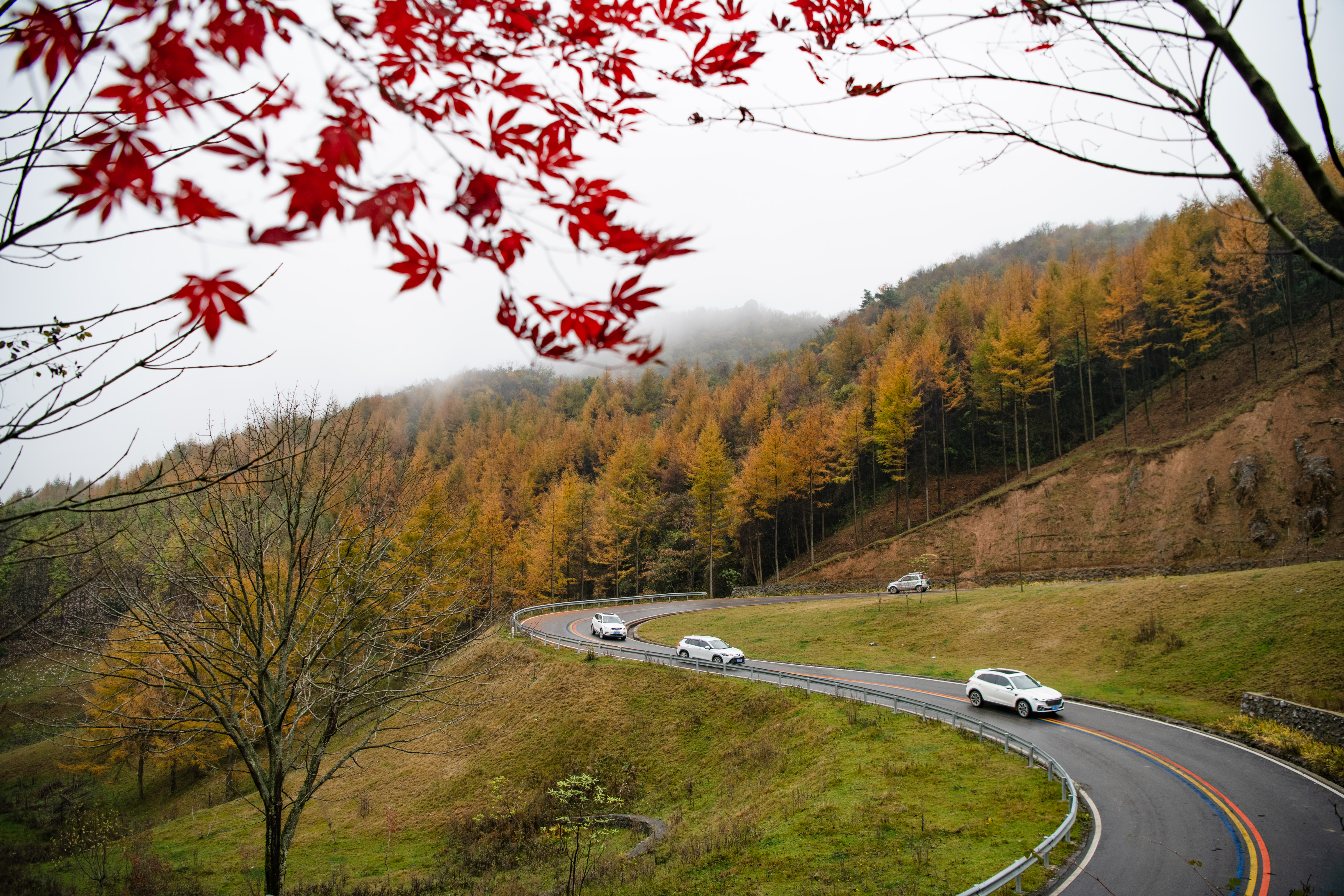 据了解,作为“全国十佳红叶观赏地”的曾家山喀斯特彩林,拥有上万亩原始森林。一到金秋时节,森林里的落叶松、野枫、青冈等各种树木相继披上了斑斓的彩衣,一眼望去,沟壑峡谷、山麓坡岭、漫山遍野,色如浓焰、如火如荼、似晚霞映红群山,美不胜收。