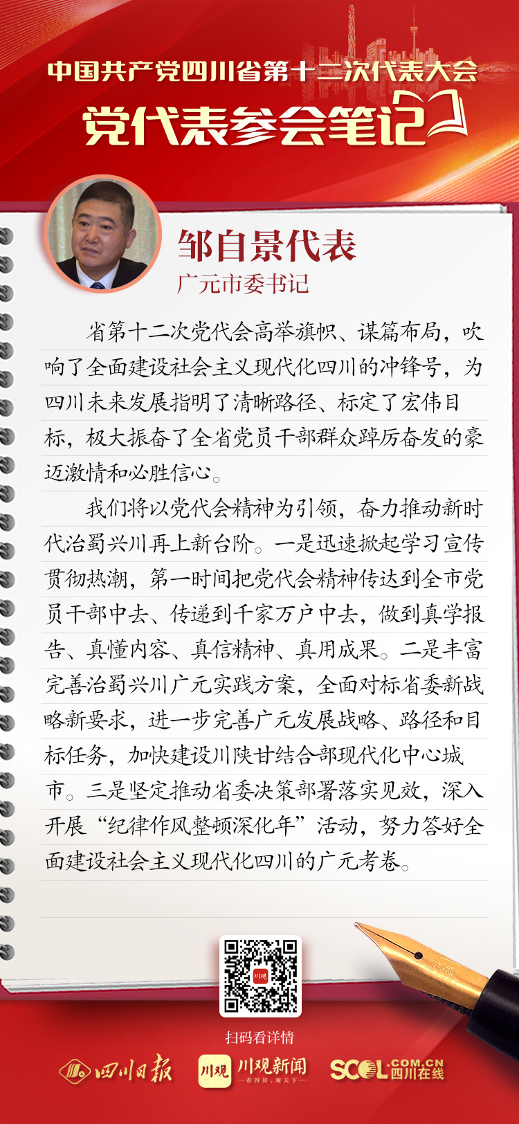 来自全省各地的党代表们汇聚一堂,聆听王晓晖代表中共四川省第十一届委员会向大会作的报告。党代表们有很多所感所思、所盼所谋。川观米兰(中国)体育·官方网站在党代会期间推出“党代表参会笔记”栏目,让我们一起来看看,党代表们“记”下了哪些重点和关注点。