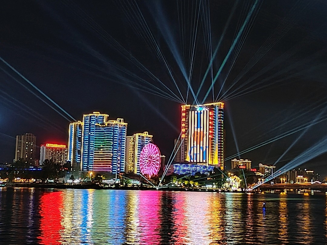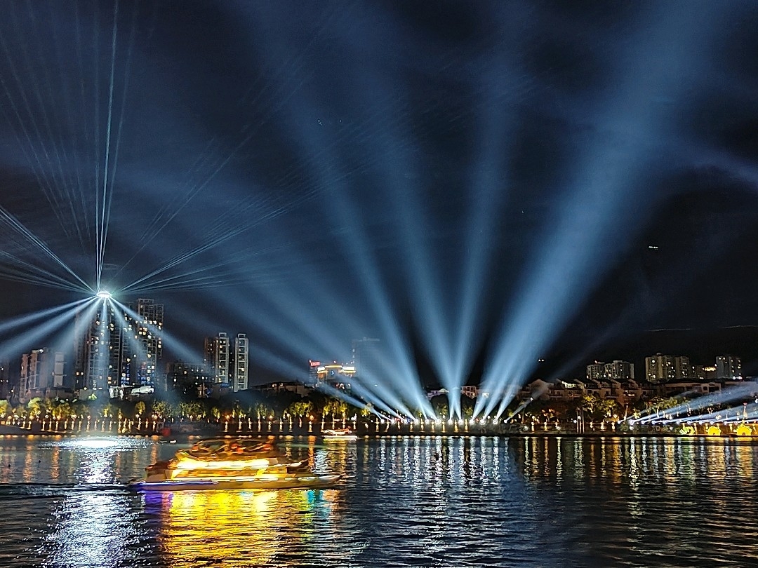8月27日晚,栖凤湖夜游活动现场,铺设在嘉陵江两岸的数百个灯组表演着美轮美奂的光影秀,展示着栖凤湖沿线夜景的独特魅力。