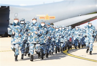 2月17日凌晨,空军出动运输机第四次向武汉空运676名军队支援湖北医疗队队员和一批医疗物资。图为刚下飞机的医疗队员列队跑步离开停机坪。新华社记者 李贺摄