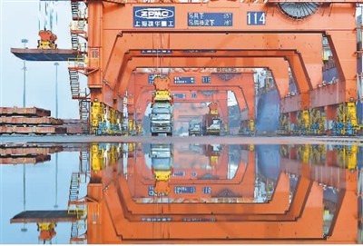 2月21日,在唐山港京唐港区集装箱码头,工人操作机械设备吊装集装箱。新华社记者 杨世尧摄