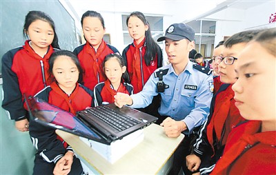 民警正在对学生进行网络安全教育,引导学生健康文明上网。蒋友亲摄(人民图片)