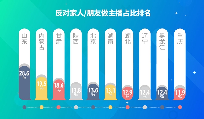 尽管多数主播得到了社会的认可,也有不少主播表示家人、朋友反对自己做主播。其中最反对家人、朋友做直播的TOP5省市为山东、内蒙古、甘肃、陕西、北京,反对比为28.6%,19.5%,18.6%,13.8%,13.6%。认为“主播不是一种职业”的TOP5省市为上海、青海、山东、甘肃、云南,占比为50.3%,48.5%,34.2%,33%,31.7%。对家人、朋友做主播支持率最高的TOP5省市恰好也是主播分布较多的地方,分别为吉林、辽宁、黑龙江、山西、天津,支持占比分别为72.0%,70.2%,69.4%,65.2%,63.6%。