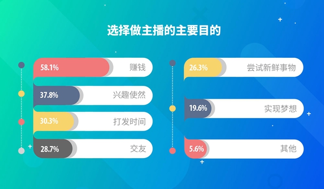 通过直播间这种线上强互动的形式,很多主播积累了不少忠实粉丝。受访主播表示“赚钱”、“兴趣爱好”、“打发时间”是自己选择做主播的主要目的。谈及“为何没有成为职业主播”,不少兼职主播表示“能力不够”、“时间精力不足”、“现有本职工作很好”,而受访直播观众也表示做主播是一件需要很强能力的工作,42.8%的观众不做主播的原因是因为“能力不够”。