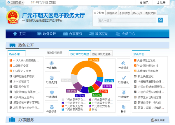 5月4日,朝天区电子政务大厅正式上线运行。我区从今年2月起开始电子政务大厅建设,历时3个月,统一使用省电子政务大厅系统,在电子政务大厅展示八类行政权力的执法依据、运行流程、办理过程、办理结果和电子监察情况,实现行政权力事项办理全程监督,向社会公众展示并提供服务。电子政务大厅还提供面向公众、法人和其他组织的政务公开、办事服务、政民互动等服务。