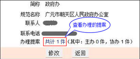 政协委员可以查看自己个人信息资料,包括“五个一”活动、出席会议的情况。部门(党派团体)可以查看本部门简称、规范名称、通讯地址、联系人及联系电话、部门权限,该页面同时显示由本部门办理(党派团体提交提案)的提案件数,并且可以进入查看具体目录(如图2)。