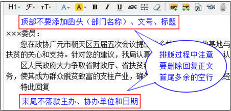 点击提案内容页面底部“草拟回复”。请自行编辑回复文号,部门函头、标题和主(协)办单位落款、回复日期由系统生成,不要在回复正文首尾重复添加(如图7)。除了分段和段首空格外,不要自行设置字体、文字大小、行间距等。如果是从网页或者WORD文档中复制内容,请使用编辑器“纯文本模式”粘贴(参照图4)。如果需要,可以在正文中插入表格、图片等附件。