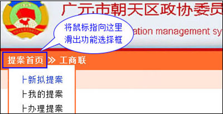 进入系统首页,点击“提案”图标,进入个人提案目录页面,将鼠标指向页面左上角“提案首页”字样,页面向下滑出选择框,移动鼠标到选择框,点击“新拟提案”即可进行提交(如图3)。