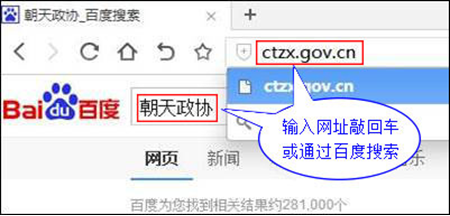 打开你的浏览器在地址栏输入网址:ctzx.gov.cn,敲击回车;或者使用百度搜索“朝天政协”字样,也可以找到网址(如图1)。