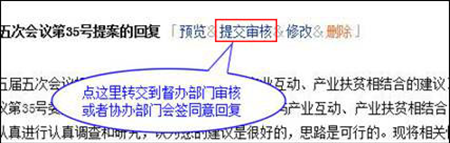 如果是多部门联合办理,点击“提交审核”就会失败并弹出提示,回复落款处显示“协办未会签”图章,通知协办部门上网查看回复并点击“会签”。协办部门可以对回复内容进行修改。