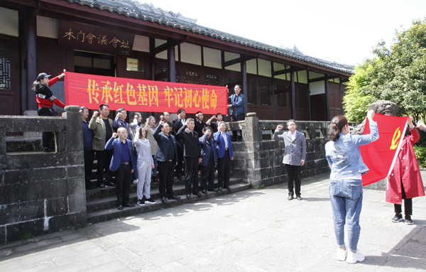 在木门会议会址前,面对党旗,全体党员干部高举右手庄严宣誓,重温入党誓词。