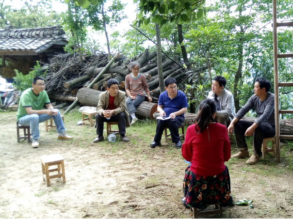 朝天区政协副主席华昌桂(右四)与梯子岩村组干部研究脱贫规划