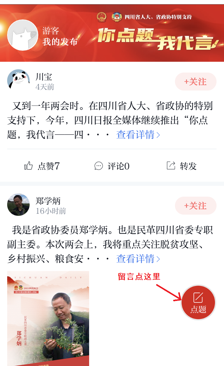 方式三:点击四川在线“你点题,我代言——四川日报全媒体邀您‘上两会’ 代表委员为你代言”活动链接或网址进行留言:https://topic.scol.com.cn/2021/21bxdt/