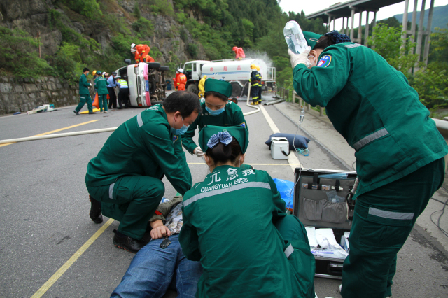 【镜头一】9时30分。广陕“二专线”中子镇庙梁村。一辆装有近40吨浓硫酸开往广元方向的大型槽罐车与一辆载有13名乘客相向行驶的中巴车发生严重碰撞,致使中巴车侧翻、15名司乘人员不同程度受伤,其中3人伤势较重,2人被困车内,硫酸泄漏至潜溪河,水体受到严重污染……