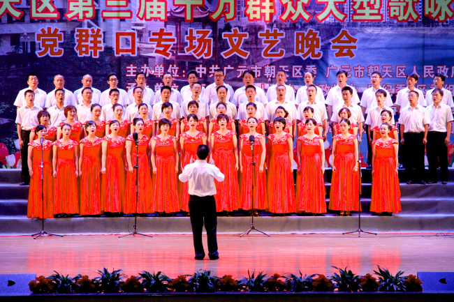 (刘保刚)曲曲红歌映丹心,缕缕心声表深情。9月28日晚,朝天影剧院灯光璀璨,歌声如潮,朝天区党群口“喜迎十八大,颂歌献给党” 大型歌咏专场晚会隆重举行。蔡邦银、伏玉琼、梁黎、贾光升、卢达昌等在家的区四大班子领导与广大干部群众一起欢聚一堂,用深情的歌声向党表达无限感恩之情。至此,朝天区第三届十万群众大型歌咏活动画上圆满句号。区委常委、宣传部长张大鸿致辞。