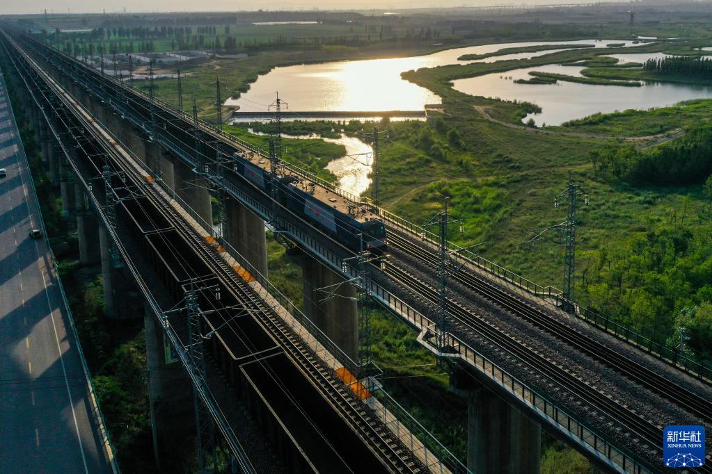 重载列车行驶在大秦铁路上(2022年7月16日摄,无人机照片)。为做好迎峰度夏能源保供工作,中国铁路太原局集团有限公司在确保运输安全的前提下全力提升煤炭运量。新华社记者 曹阳 摄