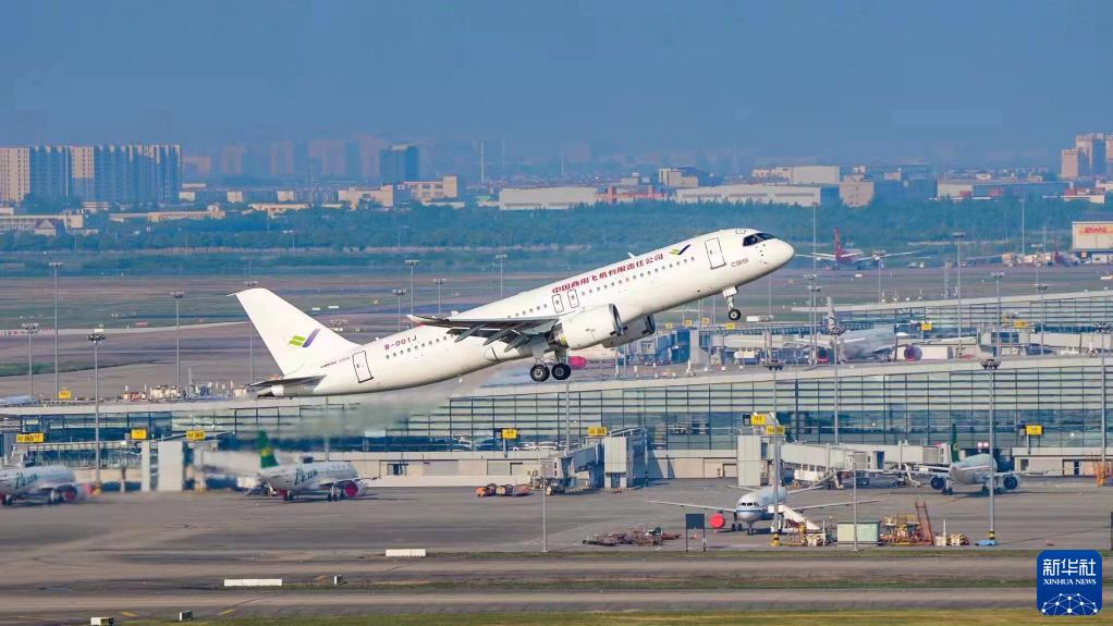 2022年5月14日6时52分,编号为B-001J的C919大飞机从上海浦东机场第4跑道起飞,于9时54分安全降落,标志着中国商飞公司即将交付首家用户的首架C919大飞机首次飞行试验圆满完成。新华社发